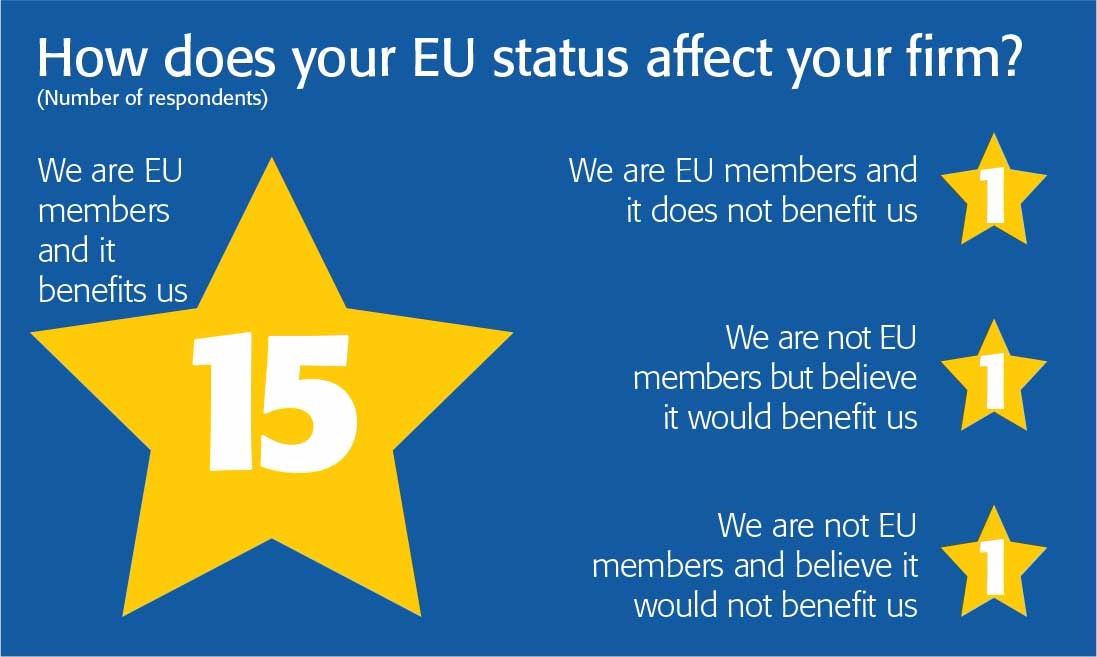 Respondents to Insurance Age’s survey gave an almost uniformly positive view of the EU. As the box above shows nearly all are based in countries within the community and only one said that they felt it did not benefit their firm.