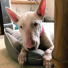 “I have been fostering Tina since February this year on behalf of Absolute Bull Terrier Rescue. She’s a 10-year-old English Bull Terrier who loves the sofa, sunshine, food, cuddles and travelling in the car. She does not like rainy weather and fish! Tina is a gentle soul who just wants a furever sofa of her own.”