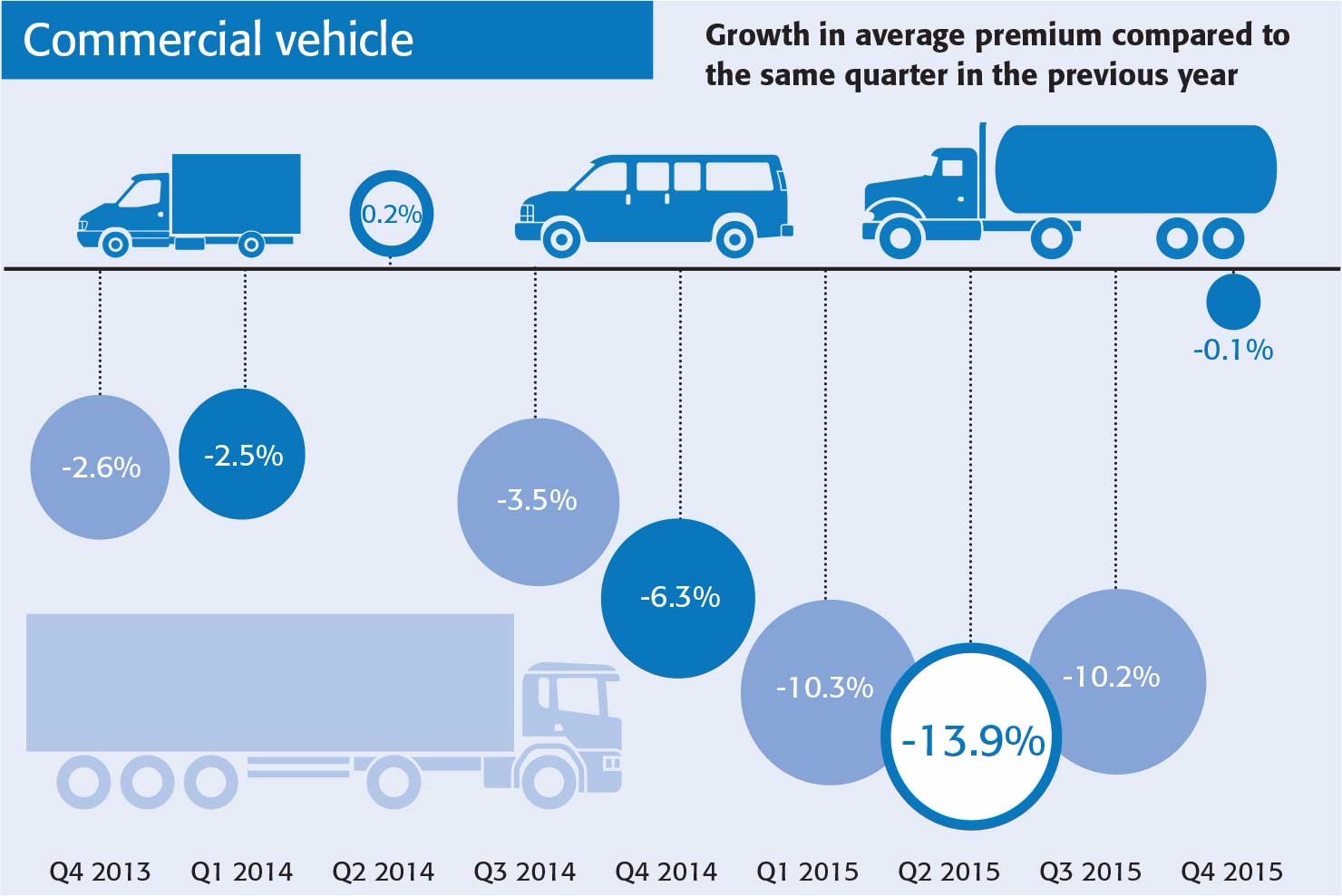 Turning to commercial vehicle, fleet and packages, those classes fell by 0.1%, 0.7% and 1.0% respectively when the last quarter of 2015 is compared with the equivalent period a year earlier. Leah remarked that he doesn’t think there’s much more room to fall in commercial vehicle following previous quarters, and it appears reductions have been factored in and the market is stabilising.